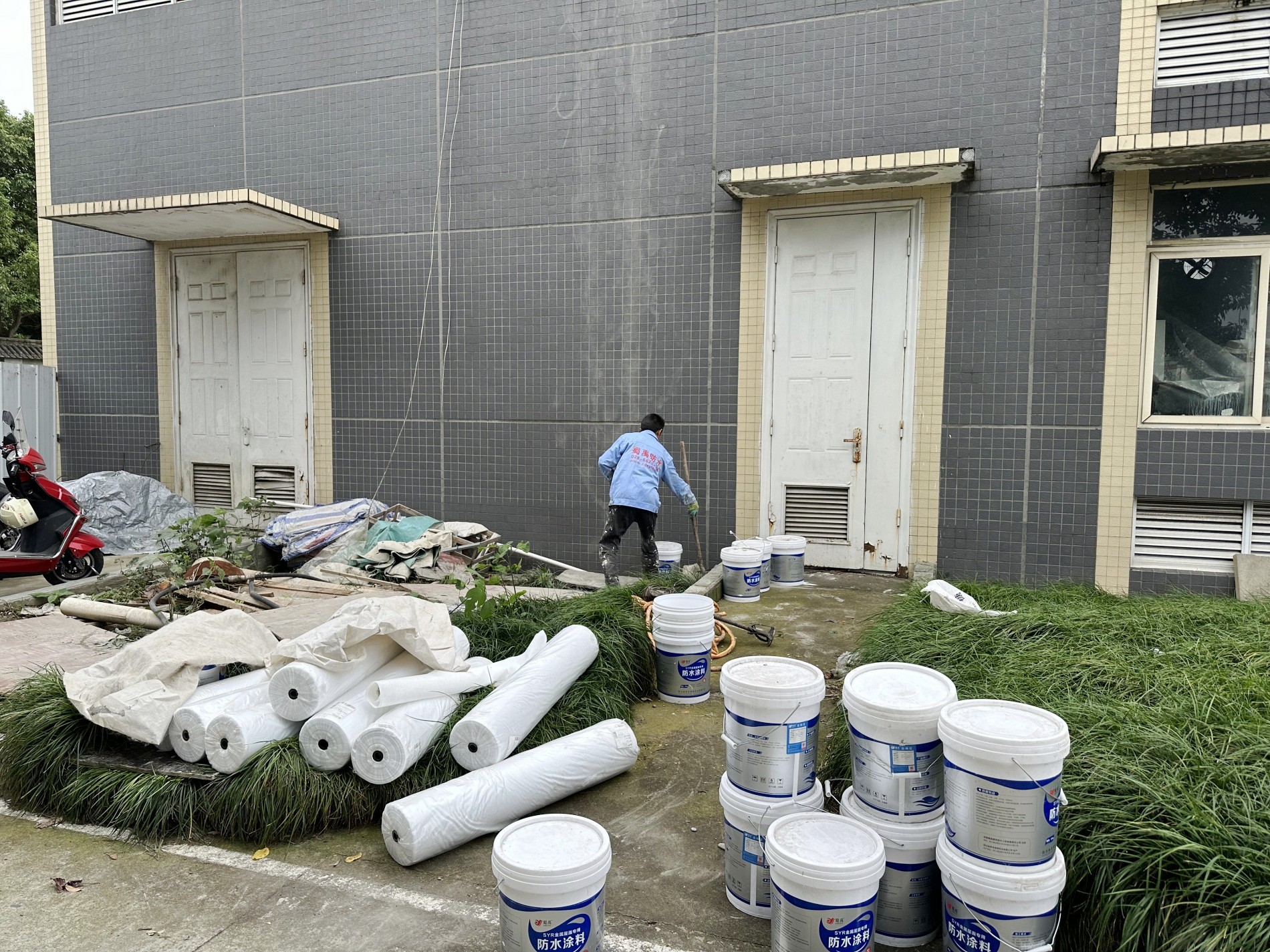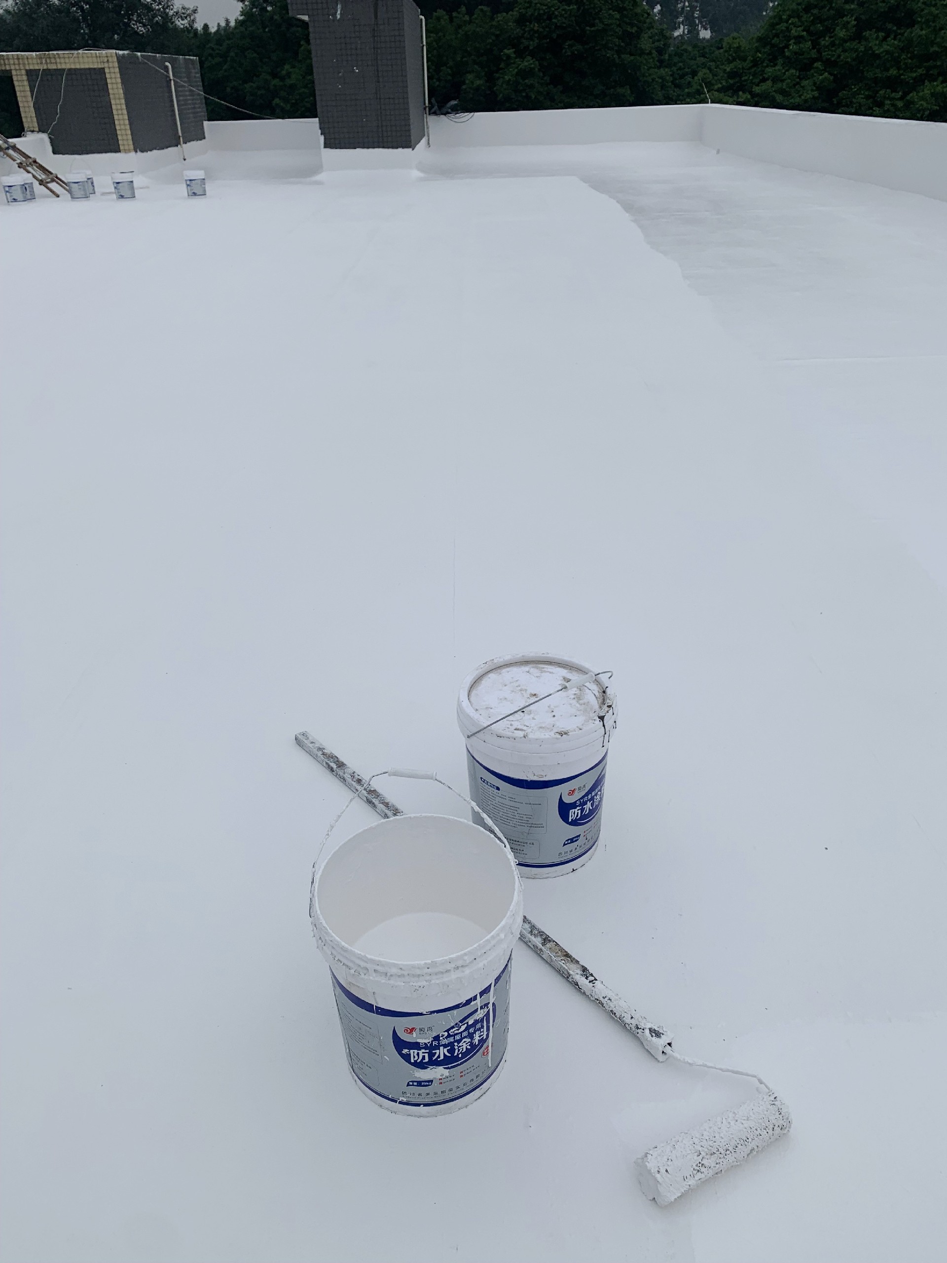 最后,待涂料干燥后,表面再滿滾涂刷(或噴涂)一道SYR金屬屋面防水涂料,形成一層外露型防水保護膜,進一步增強了防水效果。整個施工過程產生的垃圾被及時清理干凈,確保了施工現場的整潔和衛生。