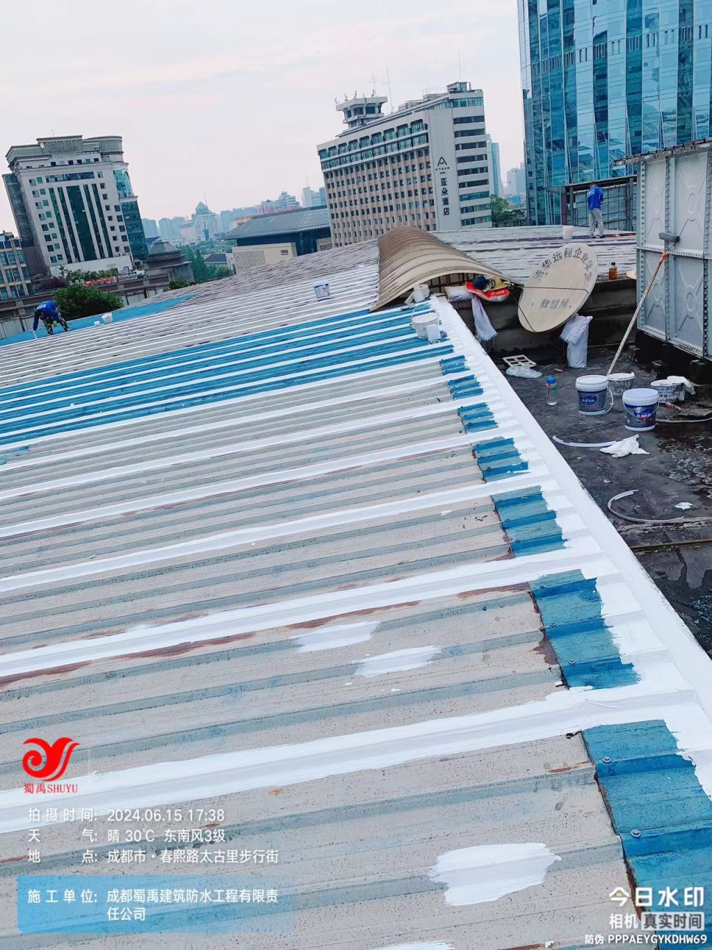 在施工過程中,成都蜀禹團隊嚴格遵守施工規范,精心組織、科學施工。從基層處理到涂料涂刷,再到縫織聚酯布的鋪設與固定,每一個環節都力求精益求精。團隊成員憑借豐富的施工經驗和精湛的技術水平,克服了高空作業難度大、施工環境復雜等不利因素,確保了工程質量和進度的雙重保障。